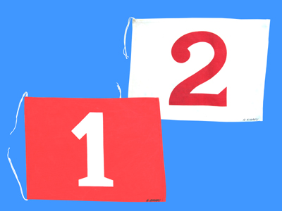 運動会の徒競争などで順位分けを行う等賞旗です。 1等から6等までの数字が入った旗と重りがセットになってます。